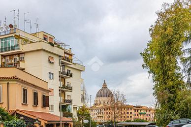 Situato al quarto piano di una palazzina in cortina, con ascensore e servizio di portineria, l'appartamento dispone di una zona giorno con angolo cottura, zona notte, servizio dotato di doccia e finestra e comodo balcone con meraviglioso affaccio diretto sulla Cupola di San Pietro.