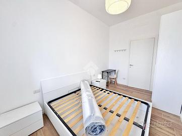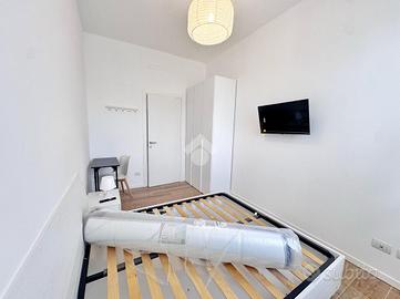 In affitto Camera spaziosa e finemente arredata in stile total white con letto matrimoniale, comodini, scrivania, poltroncina, armadio, tv (con possibilità di connettersi a Internet).