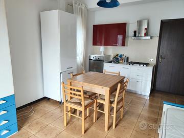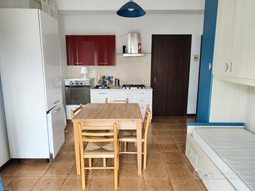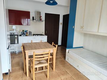 L'appartamento è posto al piano primo, ed è costituito da un unico ambiente con angolo cottura e letto con armadio a ponte (eventualmente sostituibile), con bagno con vasca e lavatrice nell'antibagno, e balcone.