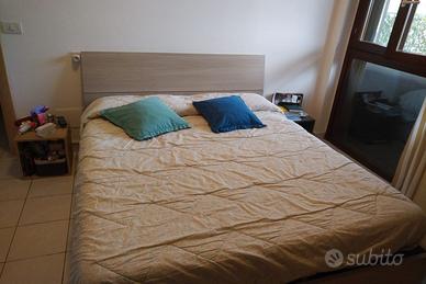 Zona living con cucina angolo cottura e forno elettrico, tavolo, letto matrimoniale con contenitore, due armadi e mobile dispensa, TV smart,