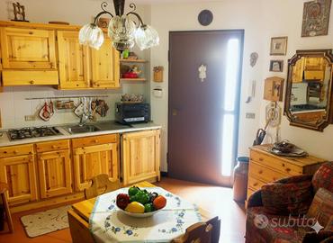 L'appartamento viene proposto completamente arredato, con cucina con stufa a gas e pensili, frigorifero, forno elettrico, allestimento area notte (divano-letto con armadio), scaffalatura del ripostiglio, 2 poltrone letto, tavolo da pranzo, sedie, sgabelli in legno, stufa a legna con canna fumaria a parete.