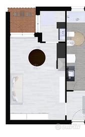 L'immobile è composto da: Ingresso che si apre su piccolo disimpegno che conduce sulla zona giorno/notte con fuoriuscita sul balcone, durante il giorno si trasforma in soggiorno ideale per accogliere amici e parenti, mentre di sera diventa una comoda zona notte, in questo spazio è compresa una cucina a vista e cucinotto per contenere il frigorifero, crea una perfetta area living ottimizzando lo spazio, andando avanti troviamo un servizio finestrato dotato di servizi appoggiati e conclude il tutto un solaio di pertinenza.