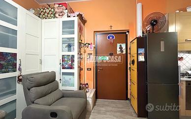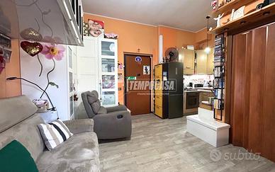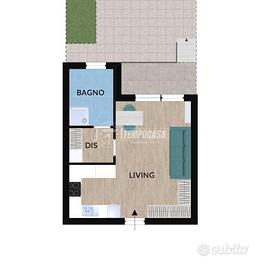 zona living con cucina a vista, bagno finestrato completo di box doccia, accesso diretto all'esterno, dove si estende un giardino di proprietà.