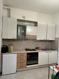 L'ingresso avviene tramite porta blindata, che conduce a un piccolo disimpegno. L'ambiente principale è un ampio open space suddiviso in zona cucina, completamente accessoriata con forno e frigorifero, e area pranzo con tavolo dedicato. La zona notte è arredata con un divano letto apribile e scaffalature/libreria.