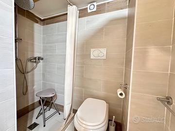 La zona giorno dispone inoltre di tavolo da pranzo e divano letto, mentre il bagno è completo di sanitari, lavabo e box doccia.