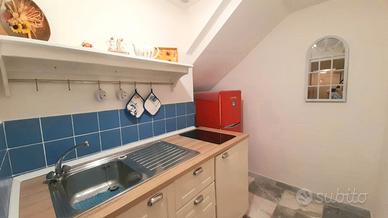 Mini-appartamento centralissimo, con uso di giardino, a 70 metri dalla spiaggia, completamente arredato e dotato di cucinotto attrezzato separato dalla stanza principale. Pronto-letto 140 cm, armadio, cassettone, ampio angolo soggiorno, ripostiglio. Adatto per max 2 persone. Solo non fumatori, no animali domestici. Qualche gradino da scendere.