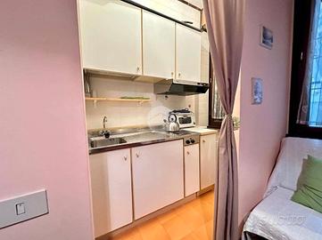 La soluzione è così disposta: entrando troviamo una zona giorno open-space con due divani letto, un cucinotto e un bagno con doccia.