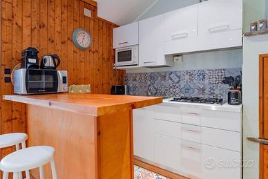 Ambiente unico: La zona giorno è versatile con un divano letto a scomparsa che si trasforma facilmente in letto matrimoniale.
