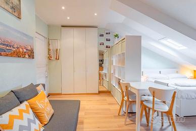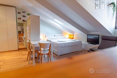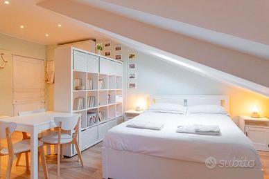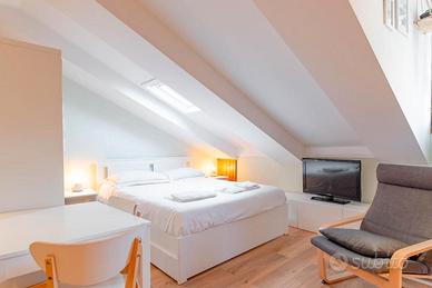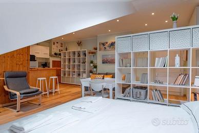 Arredi e soluzioni salvaspazio: L'immobile è arredato con soluzioni su misura per massimizzare lo spazio, come un armadio a parete, librerie verticali e un uso strategico degli specchi per ampliare visivamente la stanza.