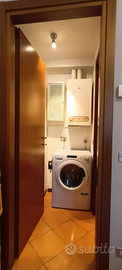 L'appartamento al 2° piano con ascensore e servizio di portineria è così composto: tavolo 4 posti pieghevole con cucina a vista, dotata di tutti gli elettrodomestici, videocitofono, divano letto, ripostiglio in soppalco, antibagno con lavasciuga nuova, bagno con doccia. Riscaldamento autonomo a gas metano. Utilizzo del terrazzo condominiale come solarium / stenditoio. PARCHEGGIO INTERNO PER MOTO E BICICLETTE. Possibilità di parcheggio a pagamento (euro 6 al giorno o abbonamento mensile) nelle vicinanze. Per referenziati con contratto di lavoro o garante.