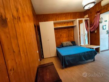 o ambiente unico soggiorno/letto con rivestimenti in legno