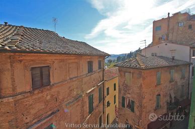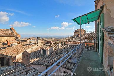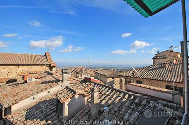 Nel corso principale del centro storico di Montepulciano, proponiamo la vendita di attico su due livelli per complessivi mq. 120 con bellissima vista panoramica sulla cittadina poliziana e sulle colline circostanti. L'appartamento si compone di ampio ingresso conviviale, cucina abitabile con dispensa, soggiorno e camera matrimoniale. Scala di collegamento interna che conduce al secondo livello composto da ulteriore camera matrimoniale con accesso a terrazza panoramica, camera singola e bagno finestrato con doccia. Ripostiglio pertinenziale posto al piano terreno. La proprietà presenta le tipiche caratteristiche dello stile toscano, come i soffitti in travi di legno. L'abitazione dispone di riscaldamento autonomo a metano e si trova in buono stato di manutenzione generale. Ottima soluzione come investimento da mettere a reddito per affitti turistici. Subito disponibile.
