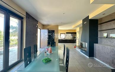L'immobile internamente è così composto: zona giorno open space con ampie vetrate, camino e accesso diretto al giardino. Cucina abitabile, dotata di tutti i comfort. Quattro camere da letto e una cabina armadio, tre bagni. Riscaldamento a pavimento per un comfort diffuso e una temperatura uniforme in ogni ambiente. Infissi in legno doppio vetro, porta d'ingresso blindata. Impianto di climatizzazione già installato. LIBERO SUBITO. Completa la proprietà : Giardino privato di 1200 mq, doppio garage: uno da 60 mq e un secondo da 30 mq, con possibiltà di parcheggio interno. La villa si trova in prima collina, in una zona residenziale esclusiva, vicina a servizi essenziali come supermercati, scuole, farmacie e trasporti. La vista mare regala tramonti indimenticabili e un'atmosfera unica. Costruita nel 2008, la villa è in buono stato interno.