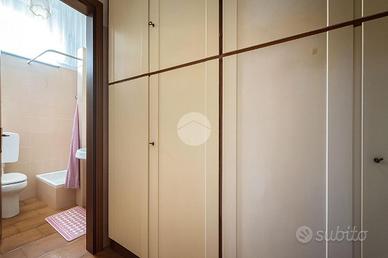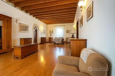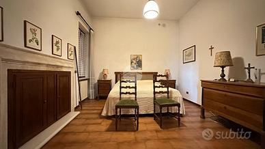 L'ampio giardino, caratterizzato da zone d'ombra, siepi e spazi aperti, contribuisce a creare un'atmosfera di quiete e riservatezza. Sul lato della villa si intravede un porticato che suggerisce la presenza di ambienti conviviali e di relax, tipici delle ville storiche utilizzate come residenze di villeggiatura.