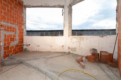 La soluzione, indipendente sui tre lati, si trova in un contesto prettamente industriale in una zona molto tranquilla e non lontana dal centro del paese. L'immobile è disposto su tre livelli e consente ad una famiglia molto numerosa di avere la propria indipendenza. Al piano terra è presente un ampio magazzino di circa 135 mq con la possibilità di sostituire il portellone di ingresso con porte a battente in modo da poter creare addirittura un'autofficina meccanica all'interno della quale è possibile posizionare tre ponti sollevatori per autoriparazioni. La scala interna conduce al primo piano dove, oltre ad un altro magazzino di 25 mq, è ubicato il primo immobile, attualmente allo stato grezzo, e ciò consente di personalizzare le rifiniture a proprio piacimento. L'alloggio in questione ha a disposizione 2 camere da letto ed una zona giorno con affaccio diretto sul terrazzo. È possibile istallare due servizi igienici. Proseguendo dalla scala è possibile accedere all'appartamento del secondo piano. Il corridoio conduce a ciascuna stanza. La zona giorno è spaziosa e contiene, un divano, un tavolo con sei sedie ed un mobile tv, oltre ad una cucina angolare. Le due camere da letto sono entrambe di dimensioni generose ed infine il bagno è fornito di doccia. Una porta finestra conduce al terrazzo sul tetto piano, ideale per prendere il sole e trascorrere pomeriggi in compagnia all'aria aperta.