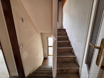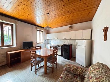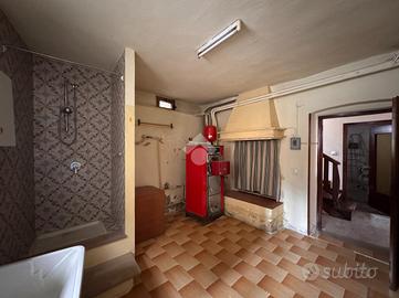Il primo piano si articola in una cucina, unita alla sala da un arco in mattoni rossi a vista, due camere matrimoniali, di cui una completamente arredata e un bagno con accesso diretto al balcone.