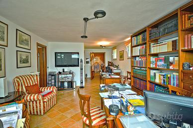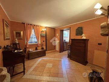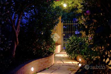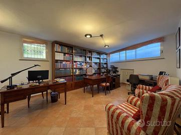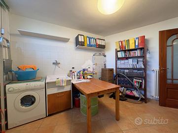 Il piano terra accoglie un grande disimpegno, uno studio, un locale lavanderia e stireria, un ampio ripostiglio, un bagno con vasca e doccia idromassaggio e il box auto collegato internamente. Al primo piano si sviluppa la zona giorno con un soggiorno ampio e luminoso, una cucina abitabile, una camera matrimoniale e un bagno con doccia; dalla zona giorno si accede direttamente all'area esterna, che rappresenta uno dei punti di forza della proprietà grazie al grande terrazzo, alla zona gazebo, all'area barbecue e al giardino piantumato con illuminazione dedicata.