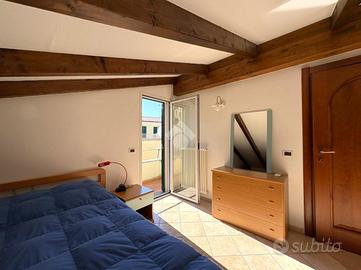 La mansarda, elegante e rifinita con travi a vista, ospita due camere, un bagno con doccia e un balcone che, unitamente a finestre e velux dona luce e aria agli ambienti, offrendo una zona notte perfetta per privacy e comfort.
