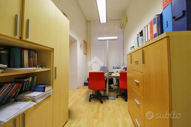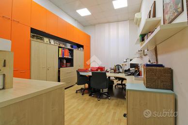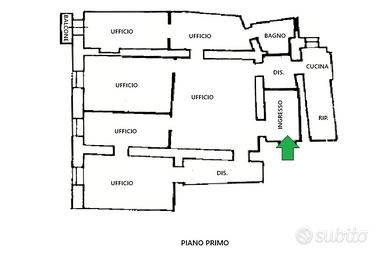 All'interno, un ampio ufficio vi dà il benvenuto, quindi si prosegue con altri cinque uffici distinti, tra cui uno arricchito da un balcone che offre una vista suggestiva sulla zona circostante. La funzionalità è ulteriormente valorizzata da un bagno finestrato con vasca, una cucina attualmente adibita a zona ristoro e un comodo ripostiglio.