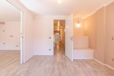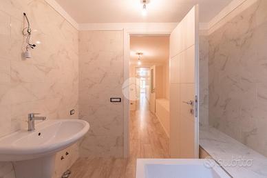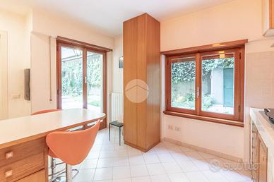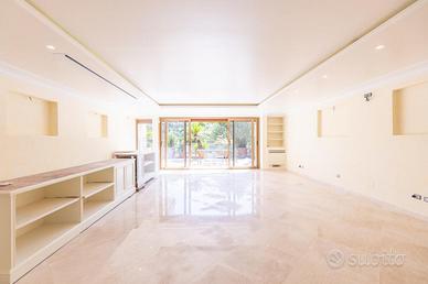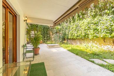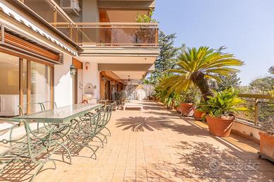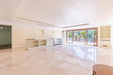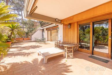 Un ampio giardino privato accoglie l'ingresso all'abitazione, donando privacy e charme. L'interno si apre su un salone doppio luminosissimo, con affaccio sul parco condominiale e accesso diretto ad una grande terrazza panoramica, perfetta per pranzi all'aperto o momenti di relax.