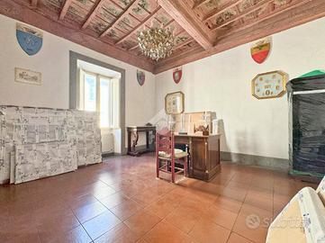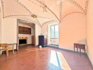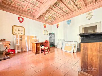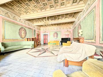 Entrando ci accoglie un ampia sala con affreschi, soffitto a cassettoni rifinito in ogni dettaglio, e pavimento in marmo. Il salone, con camino, offre un doppio affaccio sulla via principale e da accesso sia allo studio sempre con lo stesso affaccio che alla cucina abitabile.
