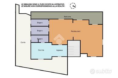 Attualmente la soluzione è così composta: ingresso su cucina con bagno per il personale, grande sala ristorante divisa in due ampi ambienti con uscita su di un balcone e due bagni per la clientela. L'immobile è dotato sia da impianto di riscaldamento che da impianto di condizionamento.