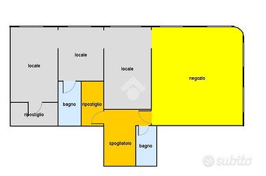 Il locale ha esposizione nord-est ed è composto di 4 ampi locali, 2 ripostigli-magazzino, spogliatoio, due bagni ed 7 vetrine su strada con due accessi.