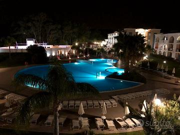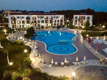Vendo due settimane Multiproprietà in bilocale nel Villaggio Toccacielo di Nova Siri. La settimana in questione è la 30 E 31 ( ULTIMA DI LUGLIO / PRIMA DI AGOSTO ). Il bilocale è abitabile per 4+1 persone, è di nuovissima costruzione, veramente ben arredato e completamente condizionato. E' composto da camera da letto matrimoniale, cameretta con doppio letto + divano, angolo cottura, bagno estremamente spazioso e antibagno , 2 balconi , tv LCD satellitare, frigo, forno microonde, piano cottura induzione, telefono, servizi, doccia ed asciugacapelli. E' presente anche un ristorante con abbondante servizio a buffet di alta qualità. Il Villaggio Toccacielo nel quale l'appartamento è situato, è formato da strutture completamente nuove e non ne presenta alcuna fatiscente. Dispone di una importante zona servizi con piscina, solarium, edicola, tabacchi, parrucchiere, lavanderia a gettoni, market, negozio prodotti tipici, campo da calcio a cinque, campo da basket, campo da tennis, tavolo ping pong, spazio attrezzato con giochi per i bambini, anfiteatro all'aperto nel quale vengono svolti gli spettacoli. Il parcheggio è interno al villaggio con posti anche adiacenti all'appartamento. Grazie alla vicinanza del mare (si accede alla spiaggia privata attraversando una pineta di circa 100/150 mt.) è un'ottima scelta per famiglie con bambini o coppie in cerca di relax. Il servizio animazione Nicolaus è praticamente tra i migliori in Italia. L' appartamento in questione, si trova a piano terra, quindi molto pratico per famiglie con bambini ed inoltre è situato in una zona del Villaggio tranquilla e vicina al percorso che porta al mare. La piscina viene sempre pulita giorno per giorno e lo spazio adiacente è composto da ombrelloni con lettini e si trova a circa 20 mt. dall'appartamento.