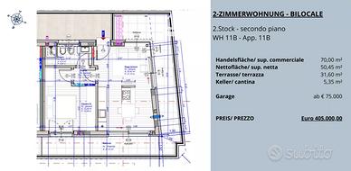 Proponiamo in vendita eleganti bilocali di nuova costruzione, situati nel centro di Bolzano, in una posizione comoda e ben servita. Ogni unità abitativa è composta da un ampio e luminoso soggiorno con cucina, una spaziosa camere da letto, un bagno moderno e una splendida terrazza ideale per momenti di relax. Completa la proprietà una comoda cantina, con la possibilità di acquistare un garage a partire da € 75.000. Un'opportunità unica per chi cerca una soluzione contemporanea e funzionale in una delle zone più ricercate della città.