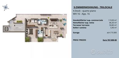 Proponiamo in vendita eleganti trilocali di nuova costruzione, situati nel centro di Bolzano, in una posizione comoda e ben servita. Ogni unità abitativa è composta da un ampio e luminoso soggiorno con cucina, due spaziose camere da letto, due bagni moderni e una splendida terrazza ideale per momenti di relax. Completa la proprietà una comoda cantina, con la possibilità di acquistare un garage a partire da € 75.000. Un'opportunità unica per chi cerca una soluzione contemporanea e funzionale in una delle zone più ricercate della città.
