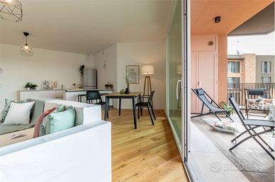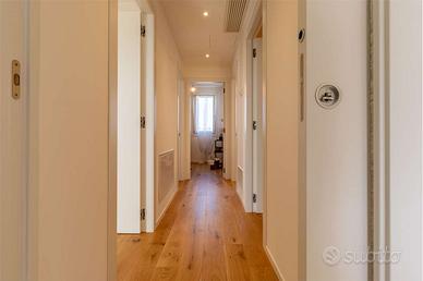 Questo appartamento si compone di sei vani, includendo una cucina ed un ampia zona soggiorno, tre camere da letto e due ampi bagni. Gli spazi interni sono distribuiti in modo ottimale, offrendo un ambiente accogliente e funzionale. Inoltre, la presenza di ampie finestre e di una vetrata di 4 mt, permettono un ottima illuminazione naturale degli ambienti, creando un'atmosfera luminosa e piacevole.