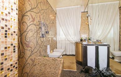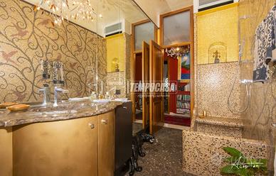 All'interno troviamo un ampio ingresso e prolungamento laterale per cassapanca e appendiabiti, un soggiorno enorme di circa 50 mq con caminetto e affaccio diretto su due lati con ampie vetrate, una cucina spaziosa servita da un secondo balcone, e un primo bagno di servizio completo di wc, doccia e pilozzo, disimpegnato e adibito a lavanderia.