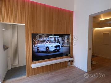 Il vano salone è dotato di un maxi schermo TV incassato in parete in legno, questo ambiente può essere utilizzato come seconda stanza da letto. La stanza da letto matrimoniale è ampia e confortevole, con una cabina armadio finestrata.