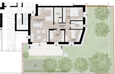 L'unità è così composta: accesso su zona giorno con angolo cottura open space di ca 35 mq con affaccio sullo scoperto privato, disimpegno, camera matrimoniale di 14 mq, camera doppia da 12 mq, camera singola da 9 mq bagno e lavanderia.