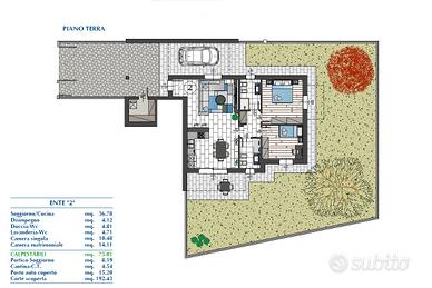 Ogni abitazione dispone inoltre di un posto auto coperto, con possibilità di chiusura tramite basculante, e di un giardino privato per la villa e l'appartamento al piano terra.
