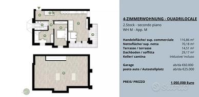 Rf.Nr: D203-4 Nel cuore dei vigneti e delle dolci colline di Santa Maddalena, uno dei quartieri più affascinanti di Bolzano, nasce un moderno progetto residenziale composto da sole 15 unità abitative. Questa zona tranquilla e immersa nel verde, situata sopra la città, è considerata una vera perla per chi cerca quiete, una splendida vista e al tempo stesso una comoda vicinanza al centro. Il quartiere è caratterizzato da tipici masi altoatesini, ampi sentieri panoramici e un'atmosfera rilassata - l'ideale per famiglie, professionisti o persone in cerca di tranquillità che desiderano vivere a contatto con la natura senza rinunciare ai servizi urbani. È attualmente disponibile un quadrilocale all'interno di questo elegante progetto residenziale, situato al secondo piano. Le unità abitative si distinguono per la funzionale distribuzione degli spazi e offrono ambienti moderni e confortevoli, ideali sia come abitazione principale che come investimento. Il quadrilocale è composto da una luminosa zona giorno con angolo cottura, due camera da letto, un bagno e una soffitta . Tutti gli appartamenti sono dotati di balcone o terrazza, mentre alcuni vantano anche un giardino privato, che rappresenta un prezioso spazio all'aperto aggiuntivo (vedi planimetrie). A completare ogni proprietà vi è una cantina privata, inclusa nel prezzo. Su richiesta è possibile acquistare un garage al prezzo di € 60.000 o un posto auto per € 25.000, offrendo così la massima comodità anche dal punto di vista della mobilità. Questo quadrilocale rappresenta una soluzione abitativa versatile e interessante in una delle zone più panoramiche e ricercate di Bolzano. Riscaldamento: centralizzato pellet Consegna: aprile 2027 Casa Clima: A Al fine di tutelare la privacy, precisiamo che gli indirizzi presenti negli annunci sono puramente indicativi. Per visionare l'immobile o ricevere ulteriori informazioni siamo a disposizione! Questo immobile viene proposto in esclusiva dall'age