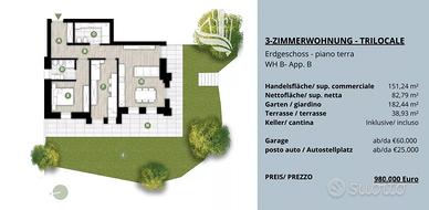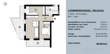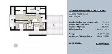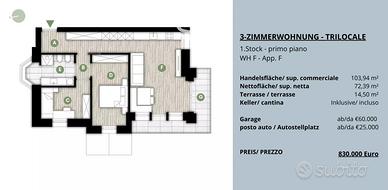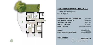 Rf.Nr: D203 Nel cuore dei vigneti e delle dolci colline di Santa Maddalena, uno dei quartieri più affascinanti di Bolzano, nasce un moderno progetto residenziale composto da sole 15 unità abitative. Questa zona tranquilla e immersa nel verde, situata sopra la città, è considerata una vera perla per chi cerca quiete, una splendida vista e al tempo stesso una comoda vicinanza al centro. Il quartiere è caratterizzato da tipici masi altoatesini, ampi sentieri panoramici e un'atmosfera rilassata - l'ideale per famiglie, professionisti o persone in cerca di tranquillità che desiderano vivere a contatto con la natura senza rinunciare ai servizi urbani. Sono attualmente disponibili diversi trilocali all'interno di un elegante progetto residenziale, situati al piano terra, al primo al secondo piano e al piano terzo. Le unità abitative si distinguono per la funzionale distribuzione degli spazi e offrono ambienti moderni e confortevoli, ideali sia come abitazione principale che come investimento. Ogni trilocale è composto da una luminosa zona giorno con angolo cottura, due camera da letto e un/due bagni. Tutti gli appartamenti sono dotati di balcone o terrazza, mentre alcuni vantano anche un giardino privato, che rappresenta un prezioso spazio all'aperto aggiuntivo (vedi planimetrie). A completare ogni proprietà vi è una cantina privata, inclusa nel prezzo. Su richiesta è possibile acquistare un garage al prezzo di € 60.000 o un posto auto per € 25.000, offrendo così la massima comodità anche dal punto di vista della mobilità. Questi trilocali rappresentano una soluzione abitativa versatile e interessante in una delle zone più panoramiche e ricercate di Bolzano. Riscaldamento: centralizzato pellet Consegna: aprile 2027 Casa Clima: A Al fine di tutelare la privacy, precisiamo che gli indirizzi presenti negli annunci sono puramente indicativi. Per visionare l'immobile o ricevere ulteriori informazioni siamo a disposizione! Questo immobile viene propos
