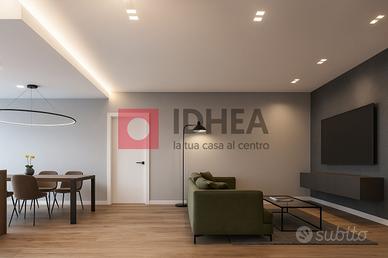 ingresso su luminoso soggiorno con affaccio tramite ampie vetrate sul terrazzo abitabile di oltre 20 mq., un comodo disimpegno, dotato di spazio per armadiatura/lavatrice, ci accompagna alla zona notte dove troviamo la grande camera matrimoniale di ben 18 mq con accesso diretto alla terrazza e un ulteriore camera singola. Completano la proprietà due bagni.