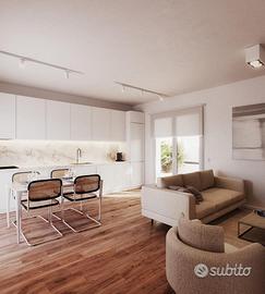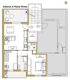 Interno A: trilocale con doppia esposizione composto da ingresso soggiorno con angolo cottura ed accesso ad una prima veranda coperta, disimpegno, camera da letto matrimoniale dotata di bagno privato, camera da letto singola con accesso ad una seconda veranda, secondo bagno, completa la proprietà la cantina e posto auto al piano terra. 240.000