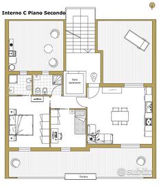 - Piano Secondo interno C, unico del piano, scenografico trilocale con doppia esposizione, oltre 70 mq di terrazze a livello, composto da soggiorno con angolo cottura ed accesso a due ampissime terrazze a livello per un totale di 50 mq con possibilità di zona barbecue, disimpegno, camera da letto matrimoniale con bagno in camera, camera da letto singola, secondo bagno con accesso ad una terrazza di 18mq dove verrà predisposta la zona lavanderia, completa la proprietà la cantina e posto auto al piano terra. 270.000