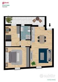 Gli appartamenti saranno composti da ingresso in cui ci accoglierà un ampio soggiorno con angolo cottura, disimpegno, bagno con doccia e due camere da letto.