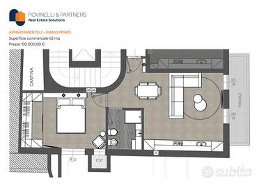 La presenza della cabina armadio nella camera matrimoniale, l'ottima esposizione a sud del poggiolo e i 62 mq commerciali rendono questa soluzione particolarmente confortevole e funzionale. In questa fase è ancora possibile personalizzare la distribuzione interna su richiesta, nel rispetto delle normative vigenti e previo accordo con la direzione lavori.