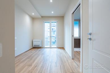 La zona giorno è composta da un luminoso soggiorno con angolo cottura e balcone. Un disimpegno con bagno padronale conduce alla camera matrimoniale con balcone. Completa la disposizione una cameretta con bagno privato finestrato e balcone posteriore, ideale per comfort e indipendenza.