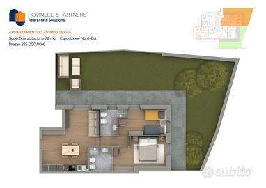 L'appartamento, situato al piano terra, offre un ampio giardino privato di 91 mq, ideale per godersi momenti all'aria aperta con vista sulle montagne. All'interno, troverai una luminosa zona giorno con angolo cottura, due accoglienti camere da letto, di cui la matrimoniale con bagno en suite, e un bagno ben rifinito. Completano la proprietà un comodo posto auto esterno e una spaziosa cantina.