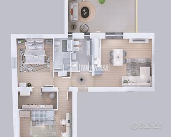 L'appartamento posto al primo piano, PRIVO di spese condominiali e ascensore, è così disposto: ingresso su disimpegno che conduce nelle varie aree, luminosa zona giorno con cucina a vista dalla quale si accede al terrazzo di 23 mq, dove poter passare giornate di sole in compagnia, proseguendo con il corridoio si giunge alla zona notte, dove troviamo primo bagno finestrato con box doccia, camera padronale con cabina armadio e bagno in camera sempre finestrato e con box doccia e per finire la seconda spaziosa camera da letto.