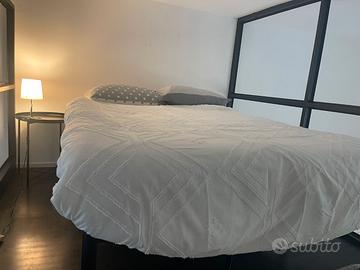 Antibagno e bagno finestrato con doccia, zona soppalcata adibita a camera con letto alla francese.