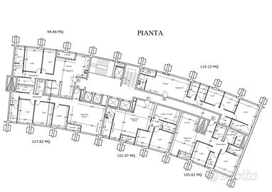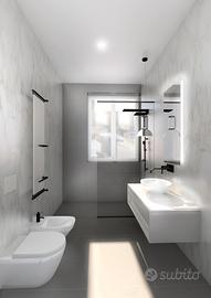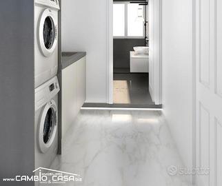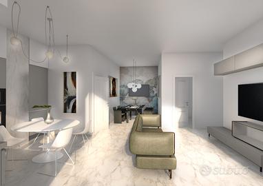 L'unità immobiliare da 95 mq è sita al 6'piano ed è composta da ingresso in ampia zona living con angolo cottura a vista, 2 vani letto, studiolo utilizzabile come cabina armadio, doppio servizio di cui uno già completo di arredo bagno con doppio lavabo e box doccia, pavimento 80x80 effetto marmo di Carrara, zona lavanderia e veranda.