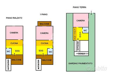 Piano Terra: ingresso in living con cucina a vista, camera letto e wc con finestre. Piano Rialzato: ingresso dal terrazzino, living con cucina, camera da letto e wc con finestre. Primo Piano: ingresso dal terrazzino, living con cucina, camera da letto con balcone e wc con finestra.