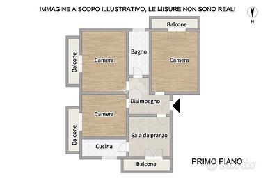 Il primo piano ospita un appartamento composto da corridoio di ingresso, sala da pranzo con accesso al balcone, cucinotto separato; corridoio, tre camere matrimoniali tutte dotate di sfogo esterno ed infine bagno finestrato ristrutturato con box doccia.