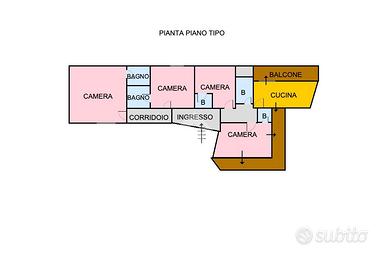 Ogni piano è strutturato come la planimetria allegata - che rappresenta uno solo dei livelli - con ampi spazi suddivisi in più camere, cucina, servizi e balconi. Questa conformazione permette di immaginare la realizzazione di tre appartamenti indipendenti, uno per ogni piano, ideali per accogliere più nuclei familiari oppure da destinare a una redditizia attività turistico-ricettiva.